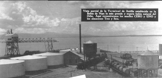 | Vista parcial de la Terminal de Antilla establecida en la Bahía de Nipe la más grande y segura bahía natural del Orbe. Aquí reconstruimos los muelles CERO y UNO u los almacenes Tres y Seis. | Partial view of the Antilla Terminal, built on Nipe Bay, the largest and most secure natural bay on the globe. Here we reconstructed wharfs zero and one as well as warehouses three and six. | ||||
