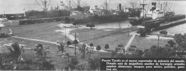 | Puerto Tarafa es el mayor exportador de azúcares del mundo. Dotado está de magníficos muelles de hormigón armado; amplios almacenes, tanques para mieles, petróleo, gasolina etc. | Puerto Tarafa is the largest exporter of sugar int the world. Provided with magnificent wharfs made of steel reinforced concrete; ample warehouses; tanks for syrups, petroleum, gasoline, etc. | ||||